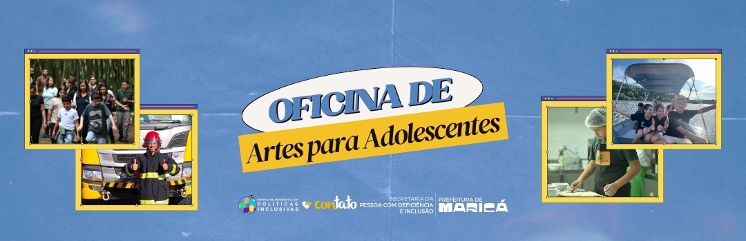 Card com fundo azul e no centro exibe o título “Oficina de Artes para Adolescentes”. nas laterais aparecem duas fotos de cada lado: um adolescente usando touca e avental em uma cozinha, um grupo de jovens caminhando ao ar livre e adolescentes sorrindo durante um passeio de barco e um adolescente na frente de um caminhão com roupa de bombeiro. Na parte inferior, estão os logos do Centro de Referência em Políticas Inclusivas (CRPI), ONG Contato, Secretaria da Pessoa com Deficiência e Inclusão e Prefeitura de Maricá.