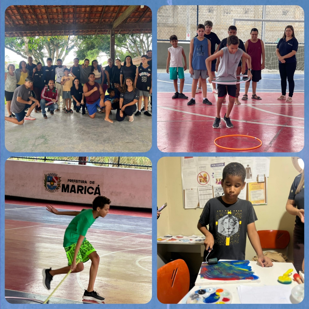 Card Inferior em formato quadrado, com fundo azul, dividida em quatro fotos.Na parte superior esquerda, adolescentes e adultos posam juntos para uma foto coletiva em um espaço coberto. Na parte superior direita, um adolescente realiza uma atividade com bambolê em uma quadra, enquanto outros observam. Na parte inferior esquerda, um adolescente participa de uma atividade motora em uma quadra, em movimento. Na parte inferior direita, um adolescente realiza uma atividade artística, espalhando tinta com um rolinho sobre a tela.
